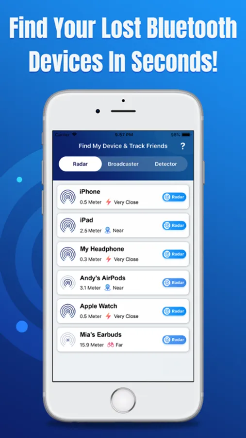 • Find your lost device in the list (Pull to refresh) and tap on 'Radar'.