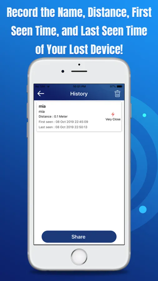 • The app will record the Name, Distance, First Seen Time, and Last Time Seen of the device you are tracking. The history information can be shared or saved as a .CSV file.