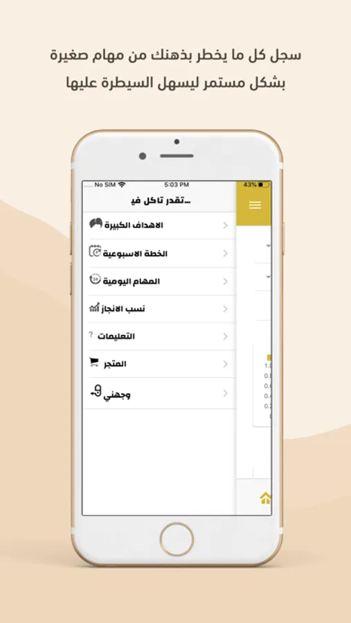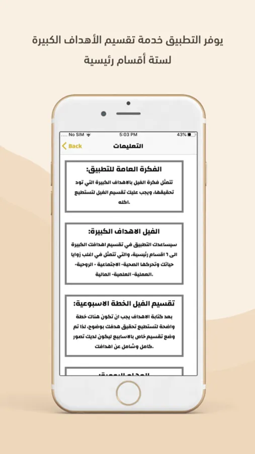 - سياعدك التطبيق في تقسيم اهدافك الكبيرة الى ستة اقسام رئيسية واللتي تتمثل في اغلب زوايا حياتك وتحركها وهي الصحية والاجتماعية والروحية والعملية والعلمية والمالية