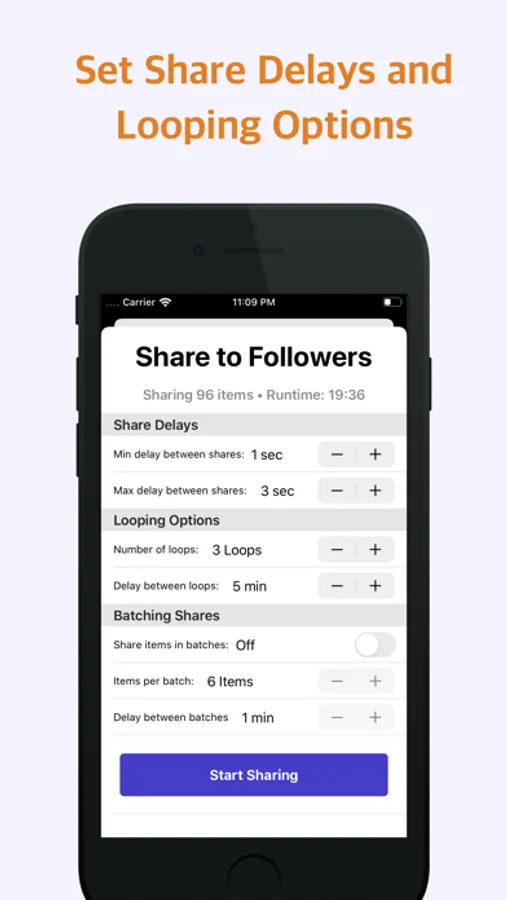 - Customize how many times to loop when sharing your items, and how long to wait between loops