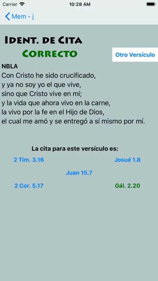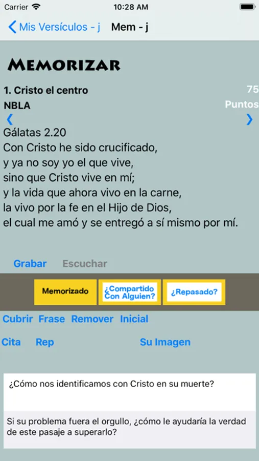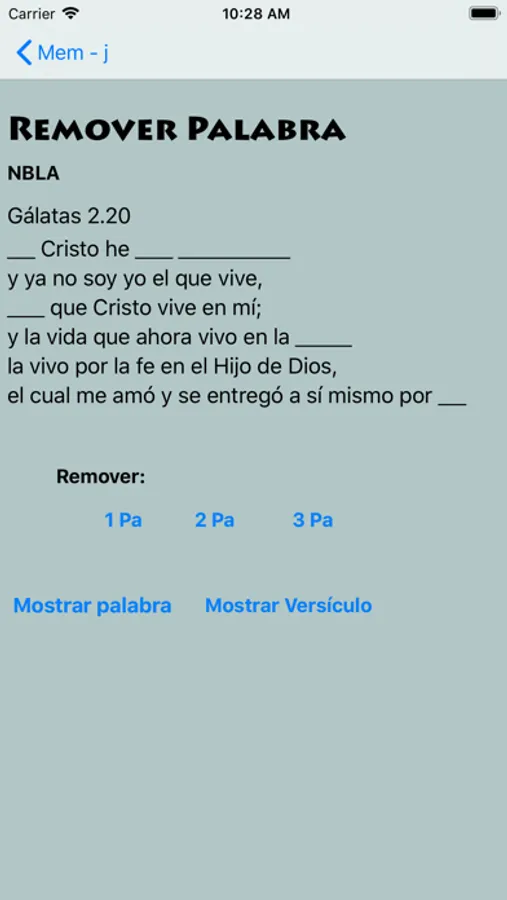 - Juegos de memoria como “Frases”, te muestra una frase a la vez, “Remover”, elimina una palabra a la vez y “Cita”, te proporciona el versículo y le permite elegir la referencia.