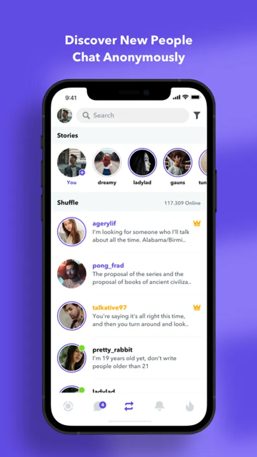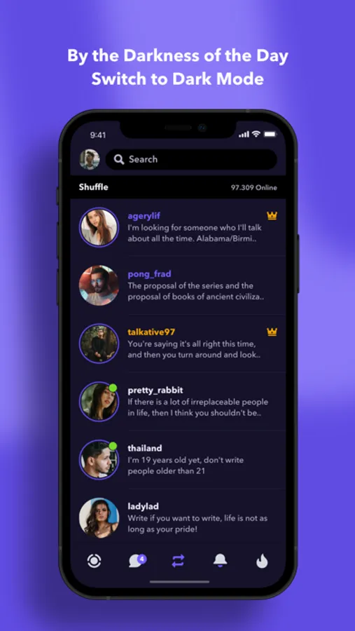Unlike most chat apps, your appearance is unimportant here, to meet and chat with new people, no one has to like or match you, pick a random person listed in the shuffle list and say hi.
