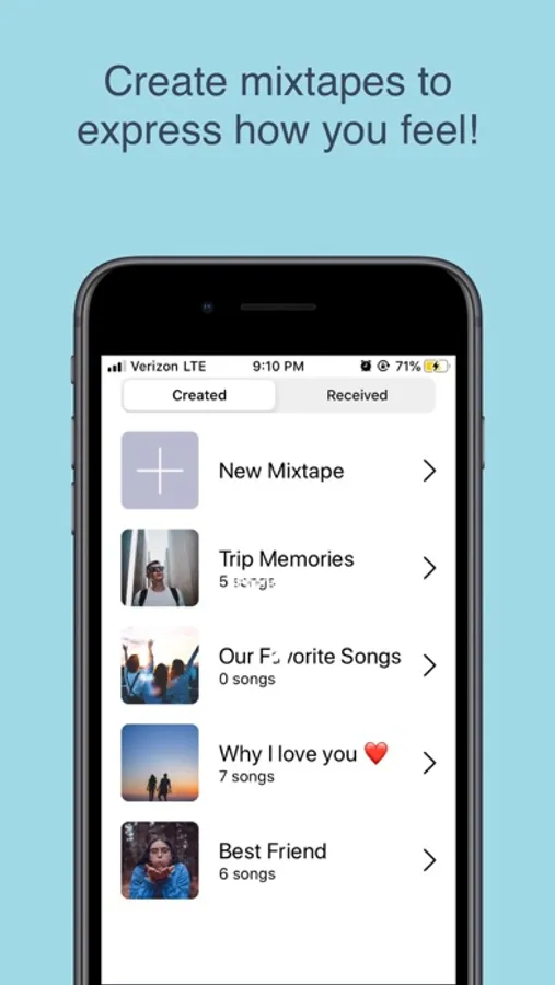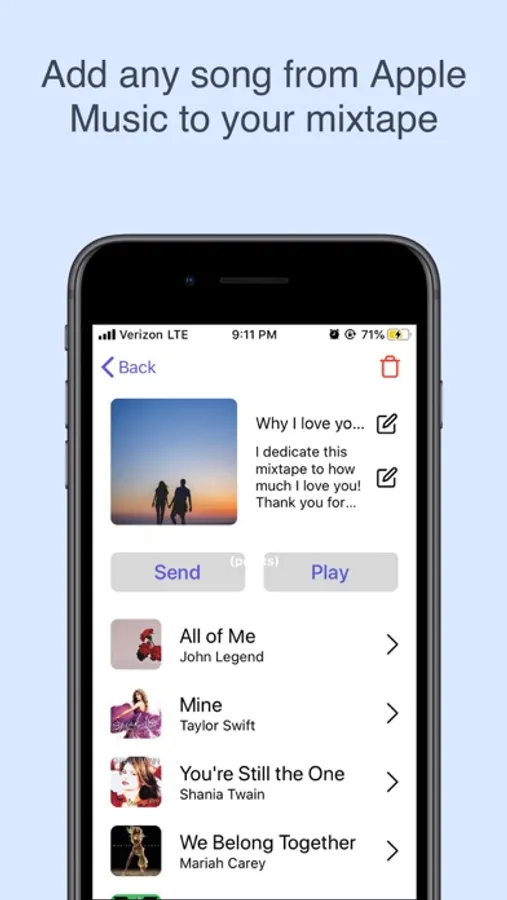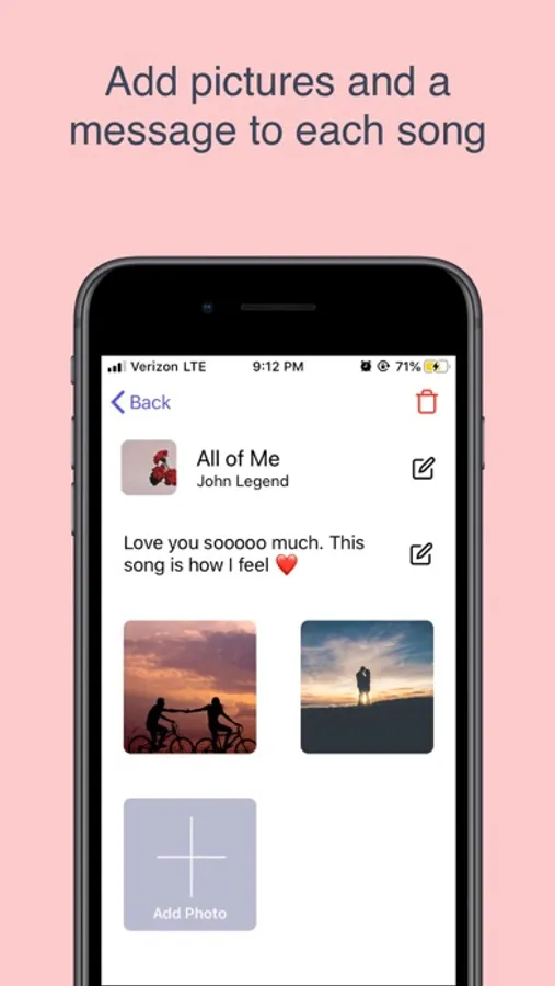 Attach your images to each song to capture a moment and add a message to each song to share why you added it.