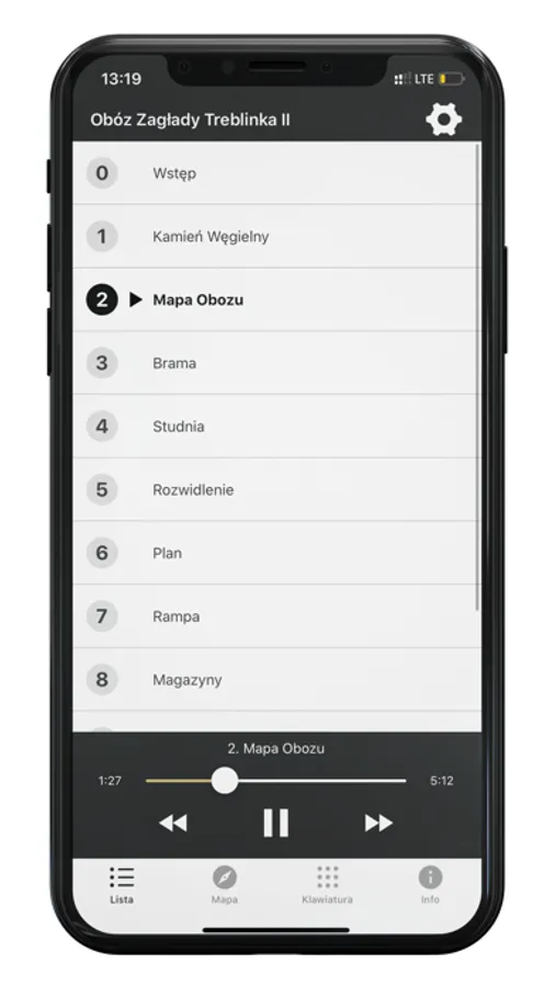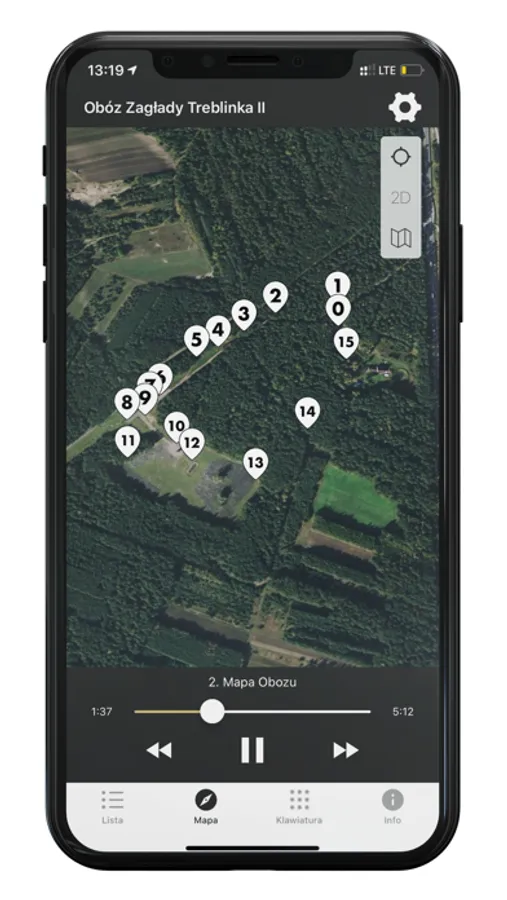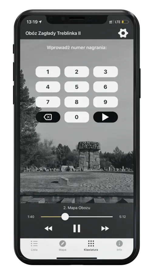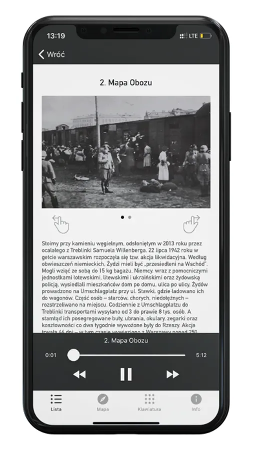 Aplikacja jest forma audioprzewodnika pozwalającego poznać historię Obozu Zagłady Treblinka 2