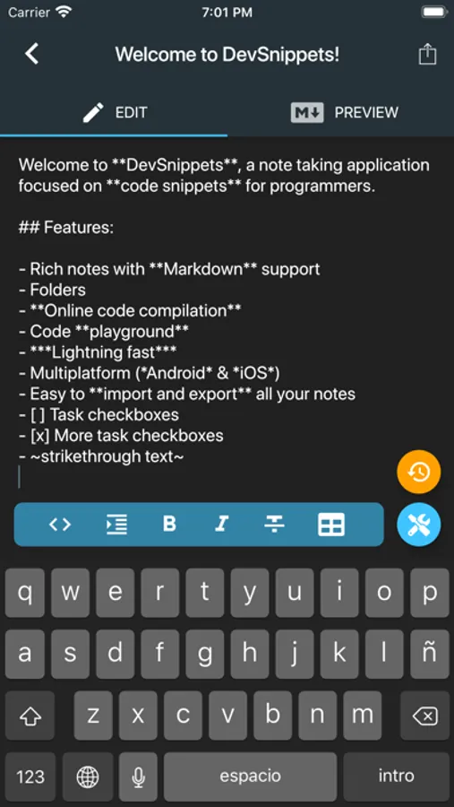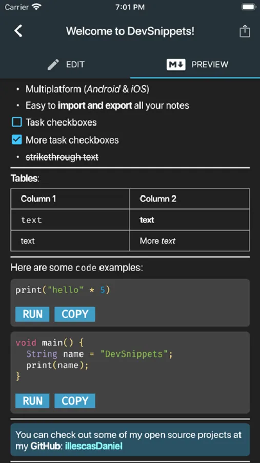 A notes app for developers! Markdown notes with code snippets and online code compilation.
