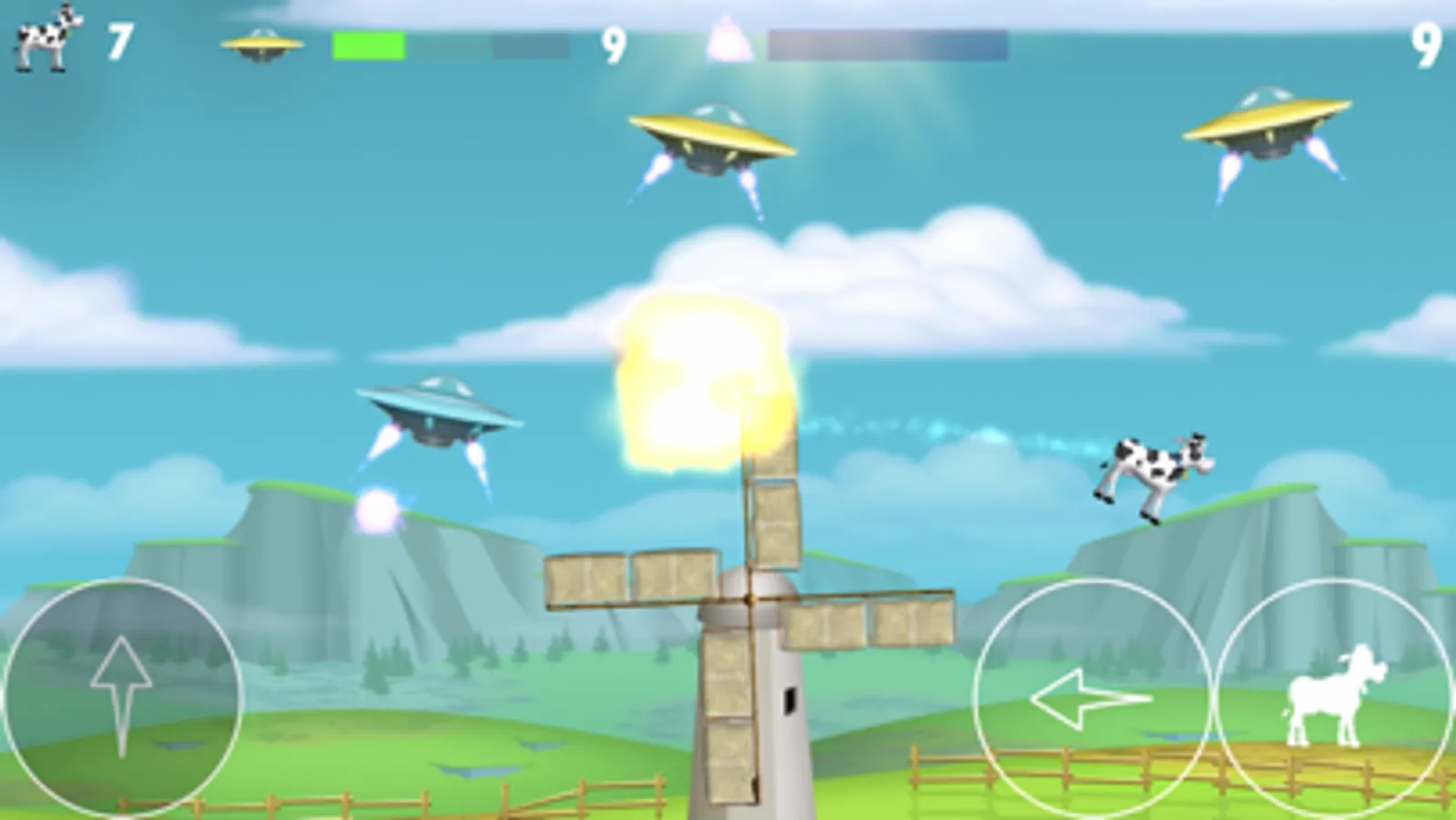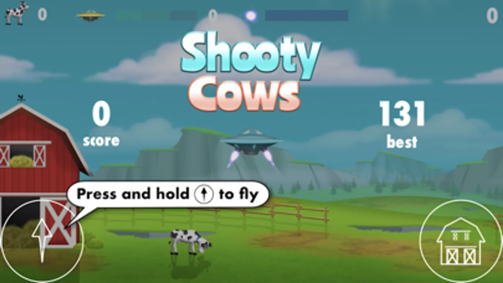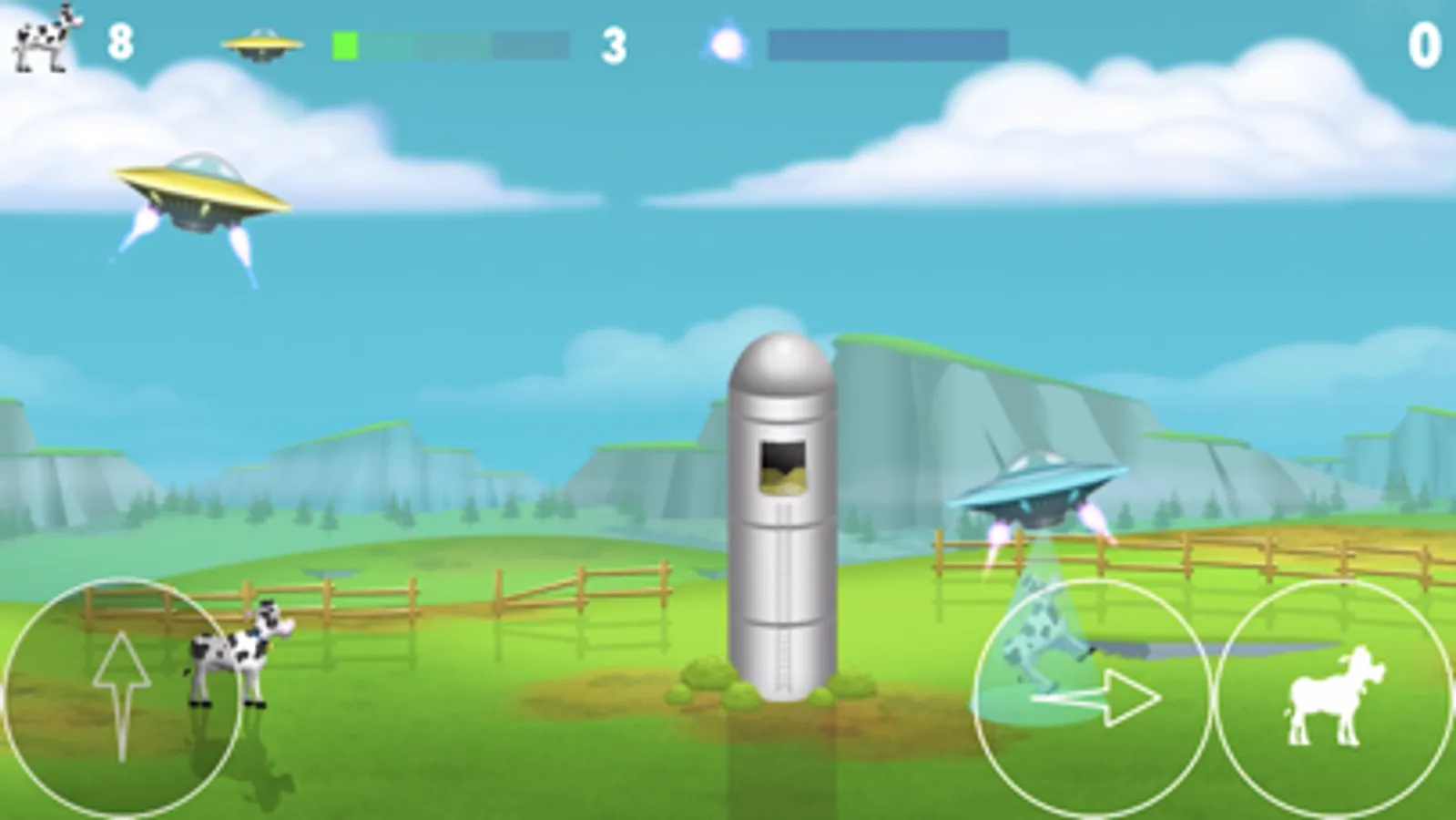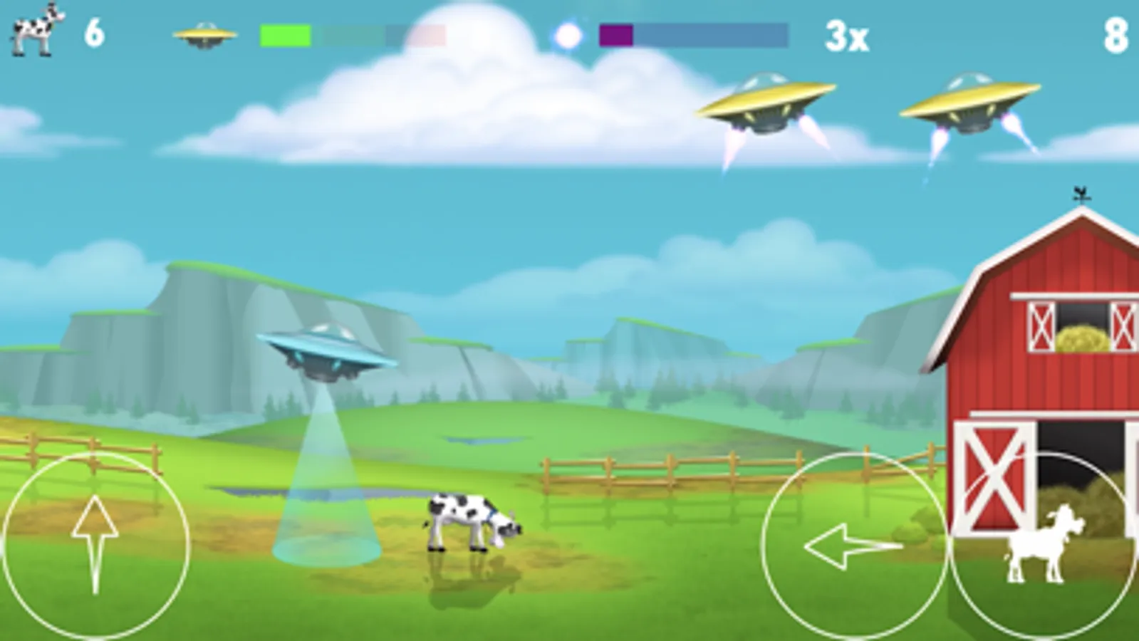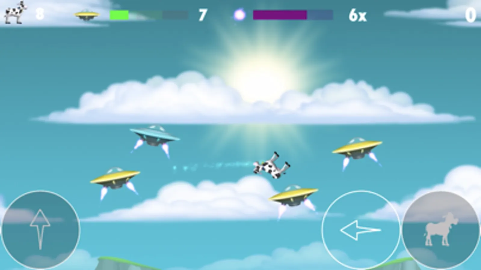 Pickup cows and launch them at your enemies in this endless bi-directional arcade shooter. Enjoy full freedom of flight by changing directions, flying low, or taking to the skies as you dodge and destroy enemy ships. But don't just shoot mindlessly, because you're not firing traditional ammo. Only the propulsion gun on your ship is working, and the only projectiles in the vicinity are the cows grazing below. You must dive low and use your tractor beam to abduct unsuspecting cows to use as bullets.