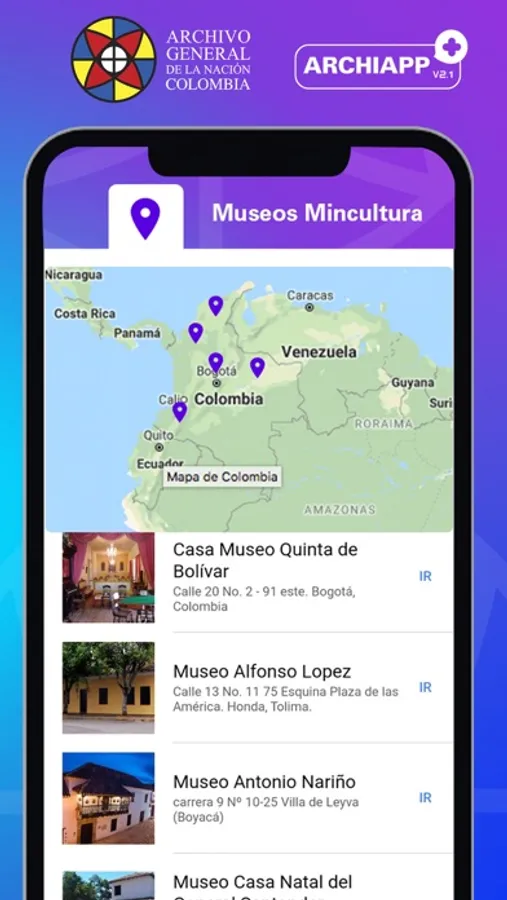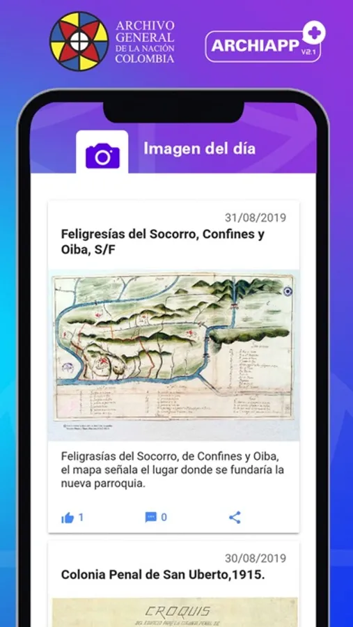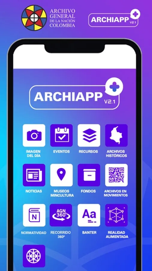 ArchiApp Plus comparte la memoria histórica por medio de las nuevas tecnologías, a fin de ofrecer una alternativa didáctica para fortalecer el conocimiento de la historia de Colombia. Es por eso que el rediseño de la aplicación móvil del AGN – ArchiApp Plus, tendrán acceso a diferentes funcionalidades como recorridos virtuales 360°, geolocalización de archivos históricos y museos de la red del Ministerio de Cultura, presentación diaria de imágenes custodiadas por el archivo en alta resolución las cuales pueden tener al alcance de sus manos como también la incorporación de la nueva funcionalidad de realidad aumentada la cual hace uso de gráficos tridimensionales que ilustran y enriquecen el relato histórico del País.