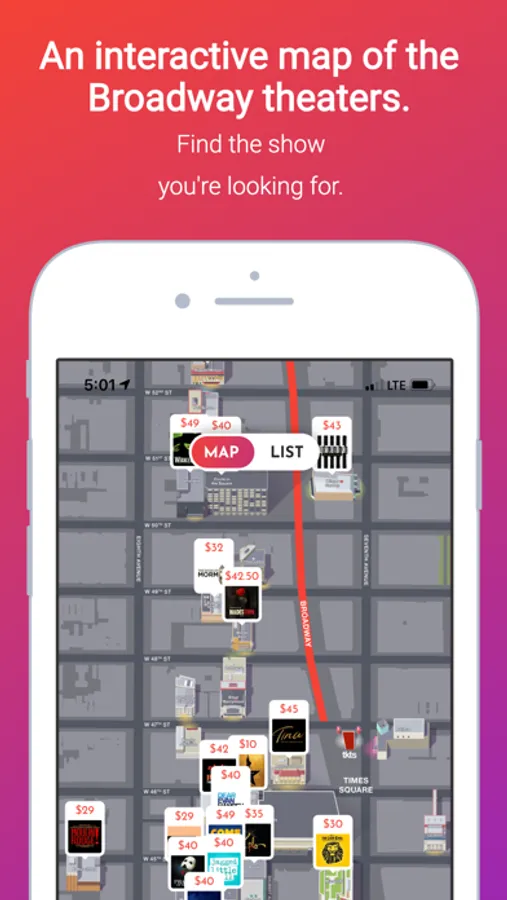 -- Use the interactive, GPS-enabled map to explore the Broadway Theater District and easily see the theaters and shows nearest to you.