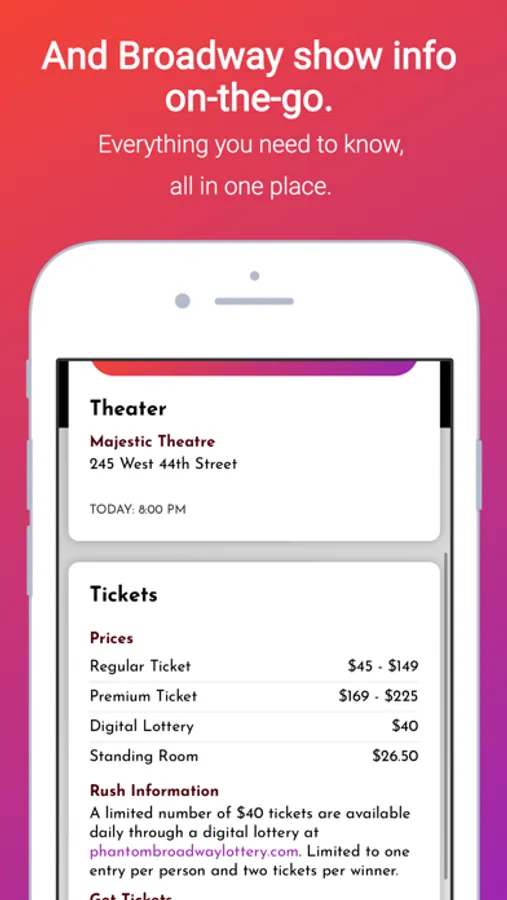-- Sort shows by ticket types: rush tickets, lottery ticket, standing room only tickets, and more.