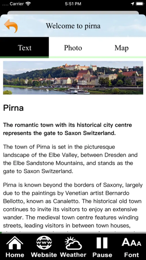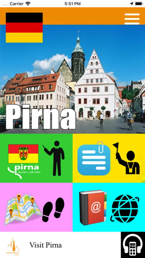 "Visit Pirna" is an international co-operation project for Prina City Guide between Prina City in Germany and Developers in Taiwan. The App aims at the mobile guide requirement to provide the best practical location-based (GPS) guide service for visitors. Main features includes text and audio guide, AR lcoation guide and VR Panorama (optional) for per places. Also the usage of interfaces of App are very properly designed for the mobile visitors. The English and Chinese contents are ready automatically for the region setting of your phone.