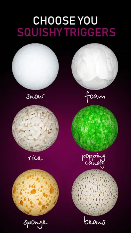 Just choose your favorite asmr triggers and press the anti-stress squish ball and you will hear the asmr sounds of the selected material.