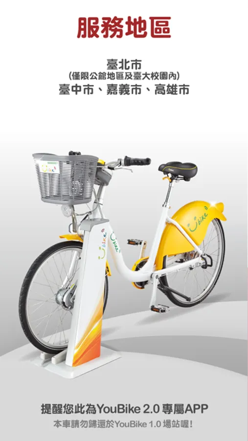 ※提醒您此為YouBike 2.0 專屬APP,欲查詢YouBike 1.0資訊,請下載YouBike 1.0 專屬APP。