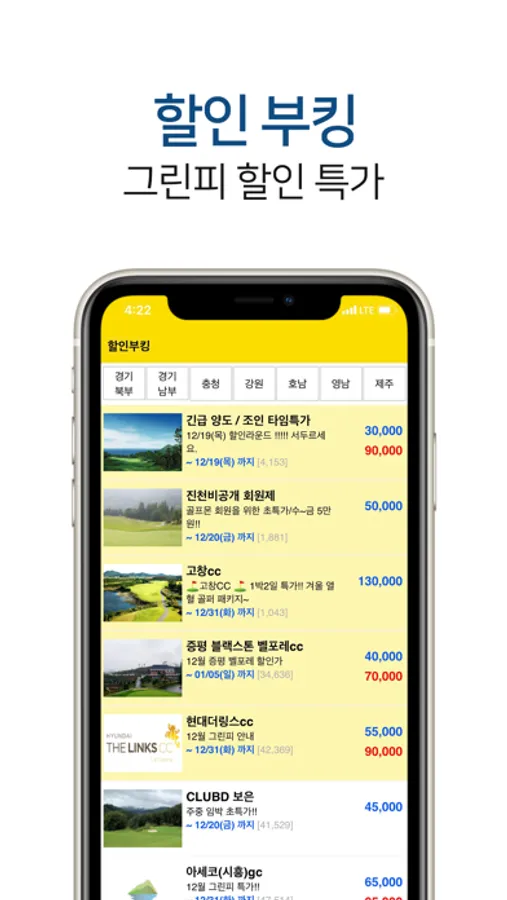 서울 인근 경기, 인천, 강원, 충청, 전라, 경상권 골프장의 잔여타임 할인부킹 및 조인 라운드