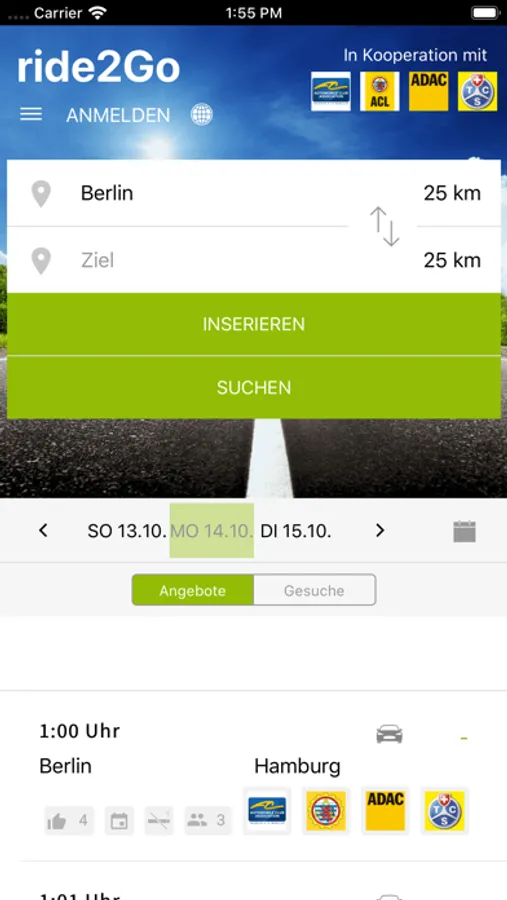 Finde und bilde Mitfahrgelegenheiten bei ride2go, mit 700.000 Nutzern und ca 1,5 Mio Angeboten eine der größten kostenfreien Mitfahrzentralen in Deutschland in Kooperation mit dem ADAC.