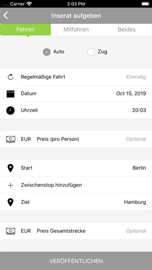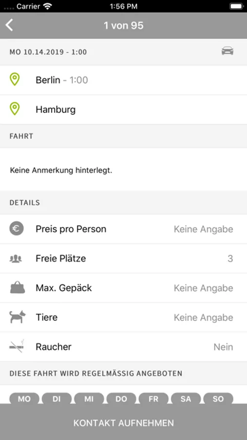 - Optionale Hinweise & Filterfunktionen: Gepäckgröße, Geschlecht der Mitfahrer, Transport von Tieren, Raucher-/Nichtraucherfahrt