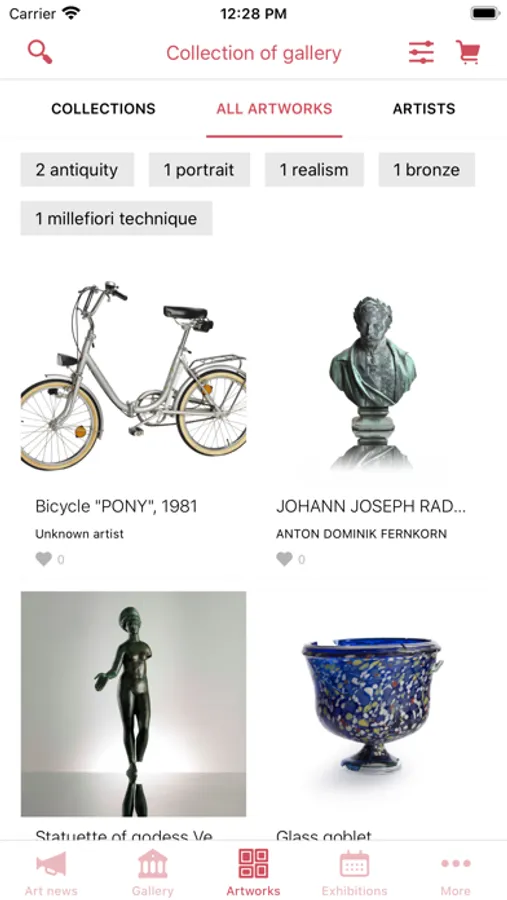 - search for interesting artefacts and artworks by filters, from title and artist to size, materials and style of art;