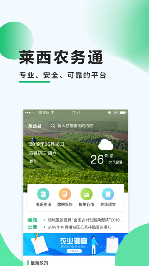 莱西农务通APP是让基层农民群体能够更快的接触使用到农业大数据服务,感受到资源信息所带来的价值,通过APP可享受到我们所提供的农技课程、价格查询、研究报告决策、市场资讯等支持服务信息。