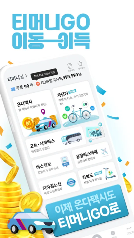 내 손안에 통합이동플랫폼! 새로워진 티머니GO와 함께 내 삶이 플러스되는 모빌리티 생활을 경험해 보세요.