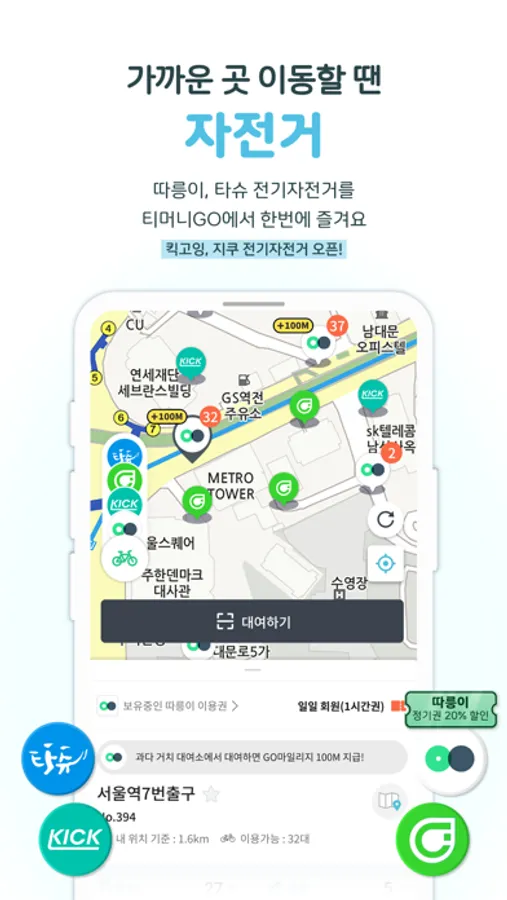 · "킥고잉", "지쿠" 전기자전거도 함께 이용할 수 있습니다.
