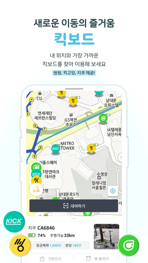 · “씽씽”과 "지쿠", "킥고잉" 킥보드를 하나의 앱에서 대여하고 반납해 보세요.