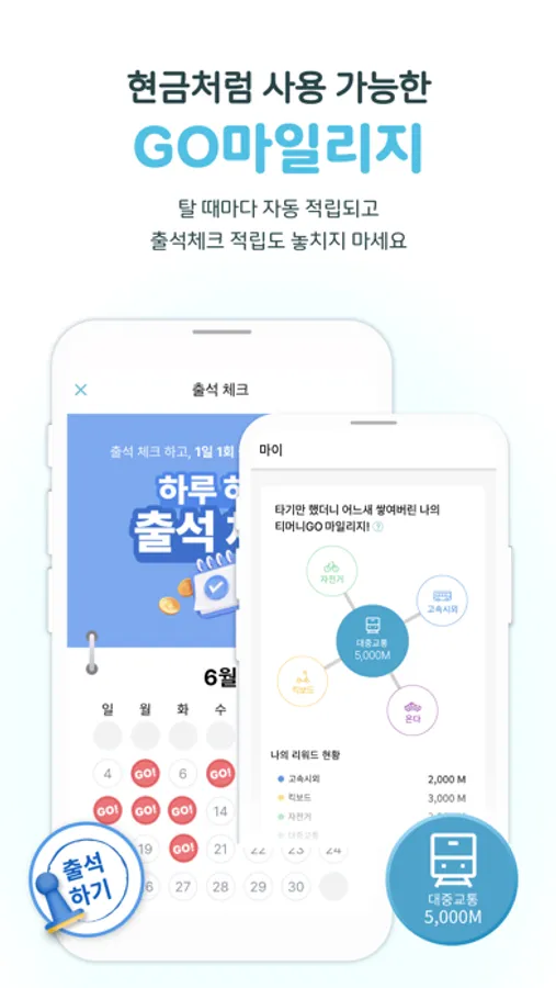 · 환승리워드/대중교통/출석체크로 쌓은 마일리지는 티머니GO의 모든 교통수단에서 사용 가능합니다.