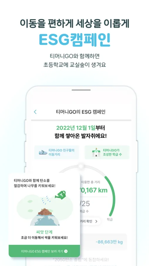 · 티머니GO 회원들의 총 이동거리에 따라 ESG 캠페인이 시행됩니다. 진행되고 있는 ESG 캠페인을 확인해 보세요.
