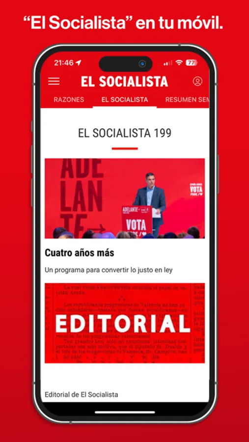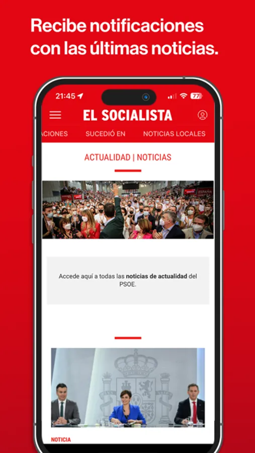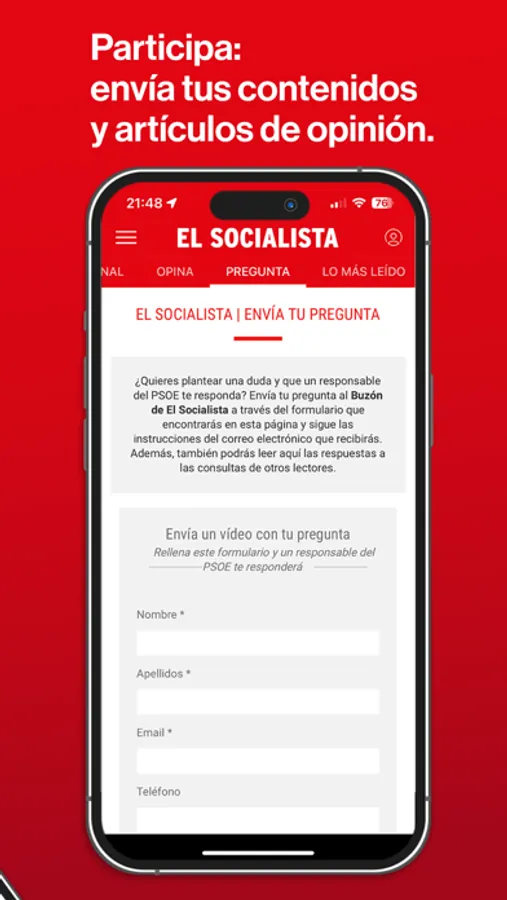 Gracias a la app podrás conocer las últimas noticias políticas, recibir alertas en tu móvil, ver vídeos en directo, acceder a contenidos exclusivos y participar en ‘El Socialista’ enviando tus preguntas a dirigentes del PSOE o tus artículos de opinión.