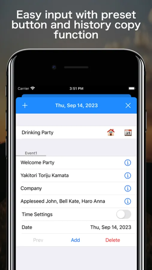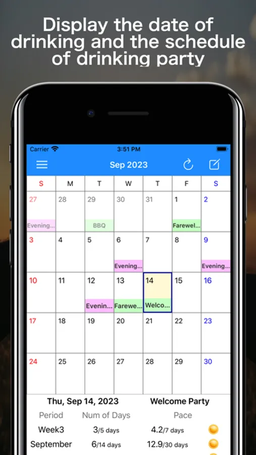 Let's register the schedule of the drinking party and manage the schedule. When linked with the calendar app, you can also determine the events registered in the calendar and automatically get drinking events.