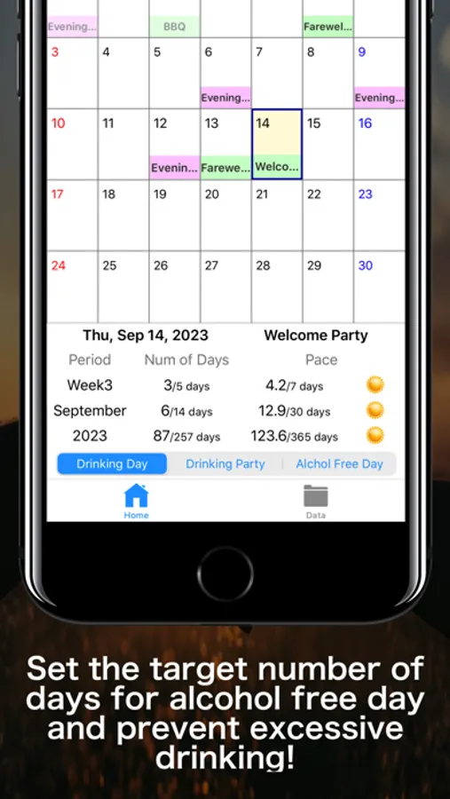 You can set the number of target days for drinking days and alcohol free days by year, month, week. The home view calculates and displays the final number of days during the period from the number of days you drank and the pace. Let’s set your own number of target days to prevent overdose.
