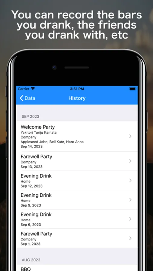 The history of drinking in the past is listed in order of date. When did you drink with that friend? Where did you have that drinking party? If you record an event that you can't remember in NomiReco, you can check it immediately.