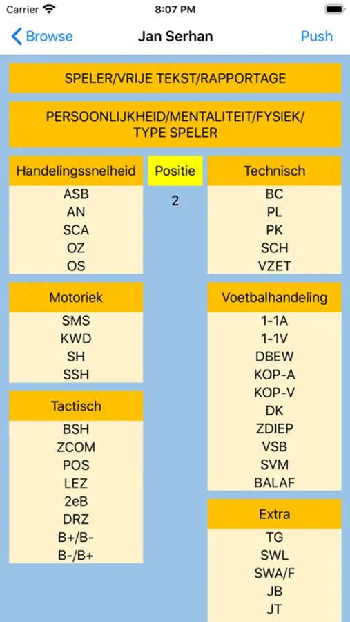 Due to the fact that you, as a soccer scout, has to write down a lot, we started to work with abbreviations. By working with this method you have more time to detect the skills of the player. By using abbreviations you can add and recognize more skills. The pleasant side-effect of this App is that the scout is forced to have an opinion about 57 different skills