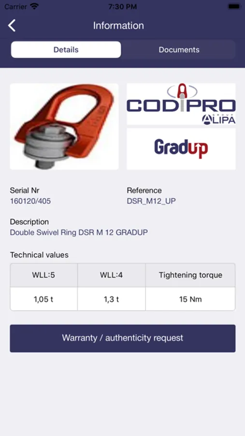 • have a quick and easy access to the general information of your swivel lifting rings (WLL, safety factor, manufacturing year, etc.), personalized certificates and instruction of use;