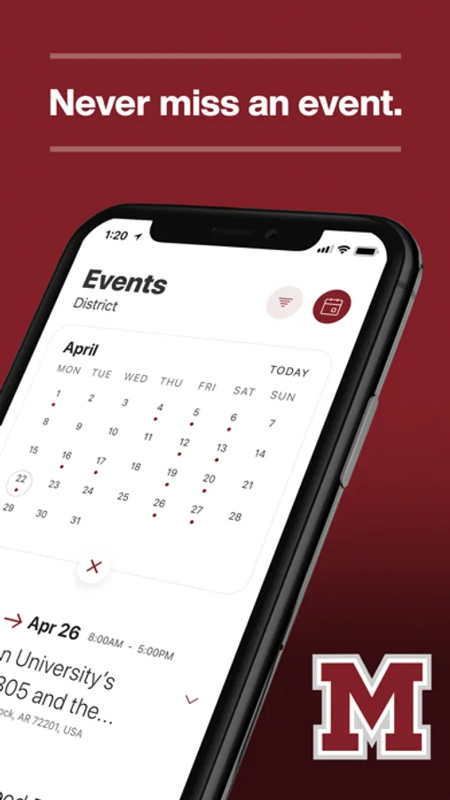The event section shows a list of events throughout the district. Users can add an event to your calendar to share the event with friends and family with one tap.