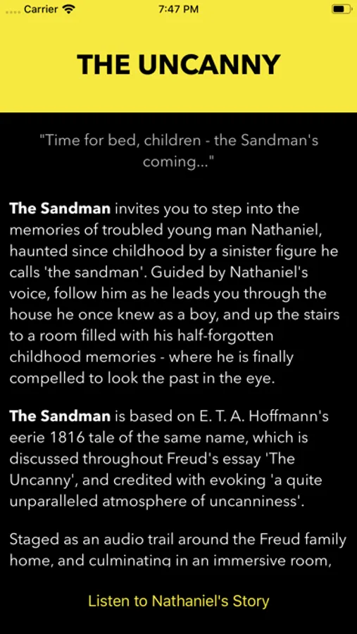 The Sandman invites you to step into the memories of troubled young man Nathaniel, haunted since childhood by a sinister figure he calls 'the sandman'. Guided by Nathaniel's voice, follow him as he leads you through the house he once knew as a boy, and up the stairs to a room filled with his half-forgotten childhood memories - where he is finally compelled to look the past in the eye.