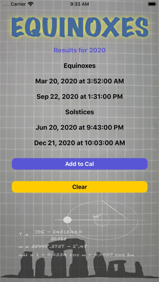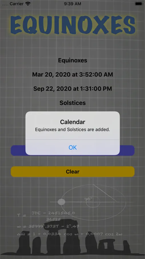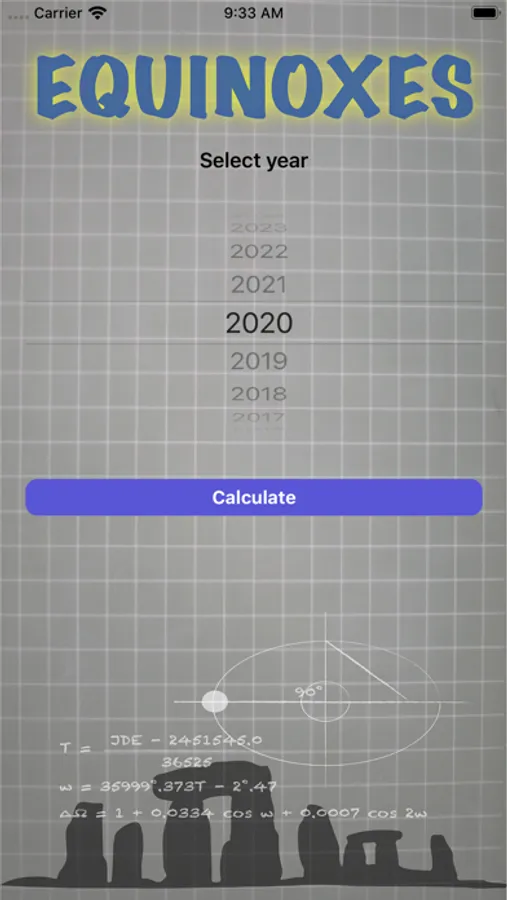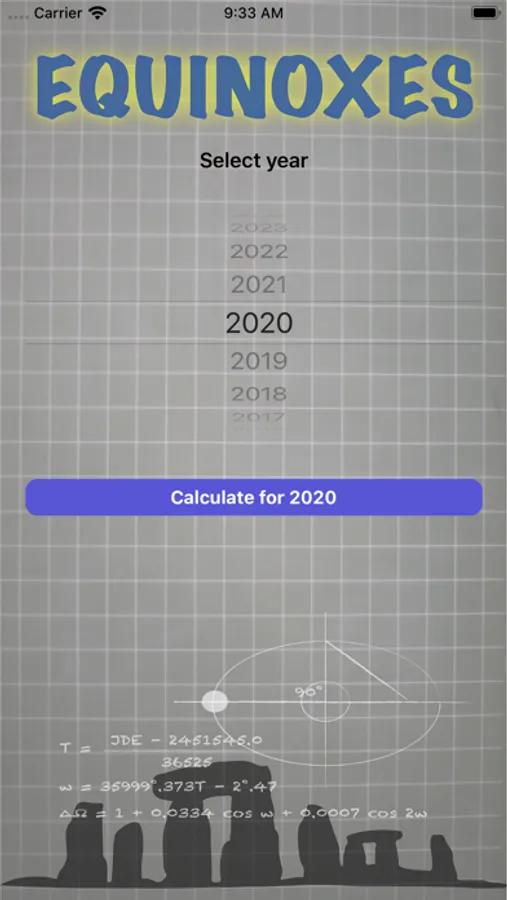 Many astronomical and astrological information depends on the dates of the equinoxes and solstices. This app calculates and informs you of these dates from the year 1000 to the year 3000, without having to resort to tables and calendars.