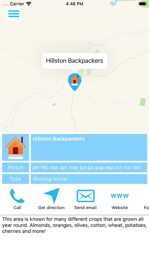 WikiFarms Australia makes it easy to find a farm. Simply use the map screen to see exactly where are located the farms. Then tap a site to bring up its description. It will show you the name of the company, type of crops, phone number, and, for some of them, website and email. You can then call the farmers directly from the app and ask them if they need workers. If you are ready to go, you can also start an itinerary from your current location and ask them in person!