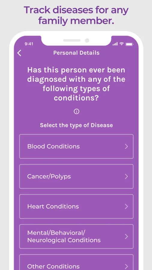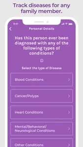 The app also allows you to connect with participating clinicians to share your family medical pedigree chart and other health data, saving you time at your appointment.