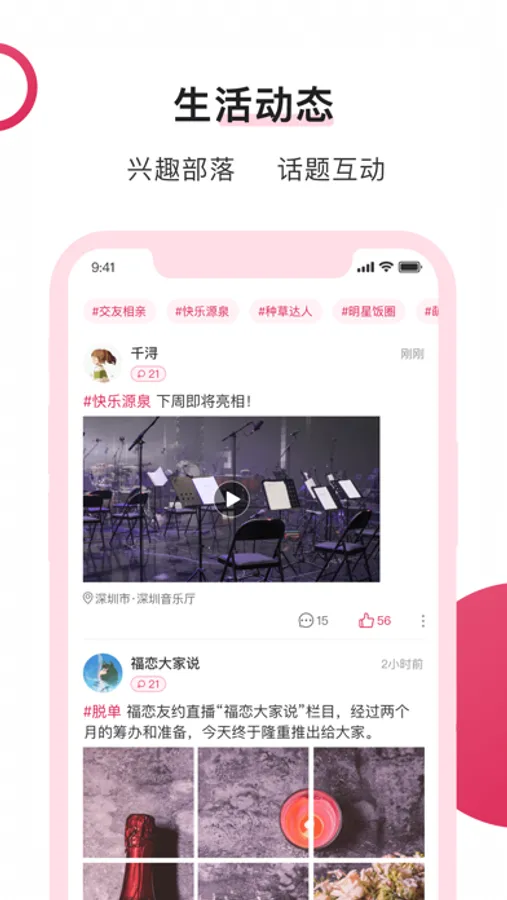 社群:与同城的单身好友一起寻找三观一致默契的ta;加入社群参与有趣的话题 互动,让生活充满趣味;