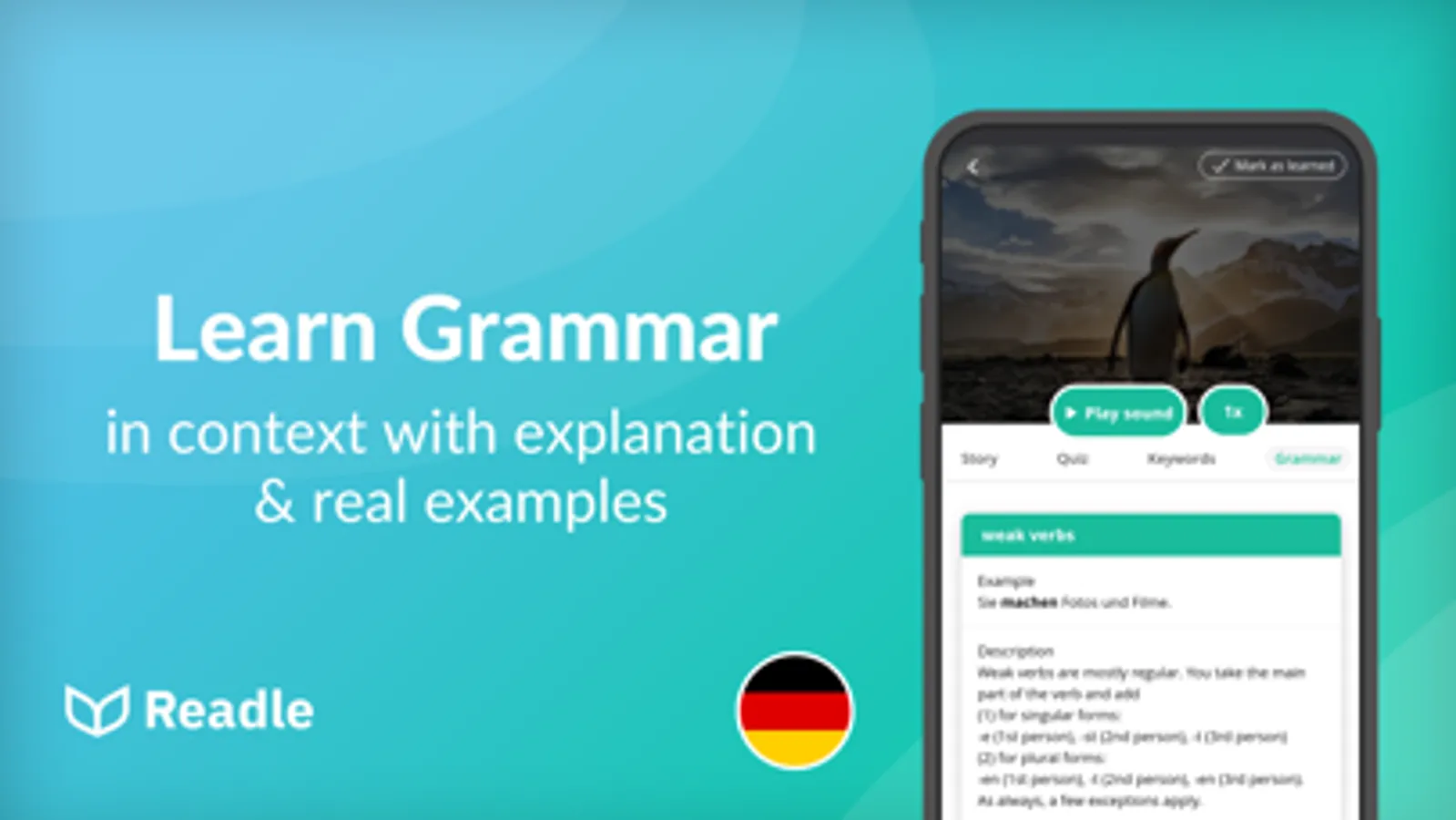 - A detailed explanation of key grammar and key vocabulary for your story is a tap away. Learn how to finally use German grammar easily due to practicing in multiple contexts.