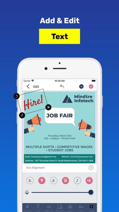 - Invoke text in the Hiring Poster or Flyer via the text section that facilitates user-readable font styles and diligent color options.