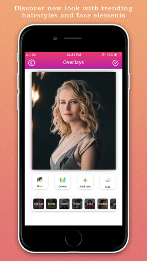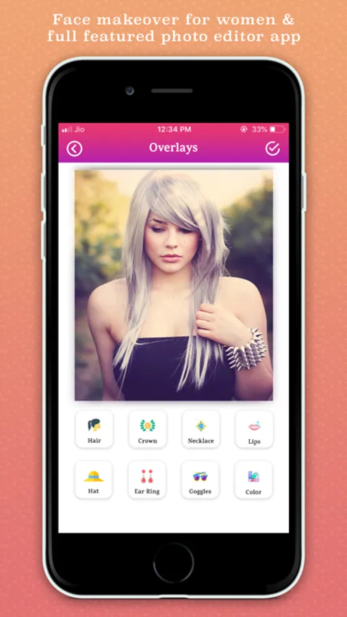 This app helps you to create photo with hair style, hair crown, necklace, lips, hat , ear ring, goggles, stickers and text overlay.