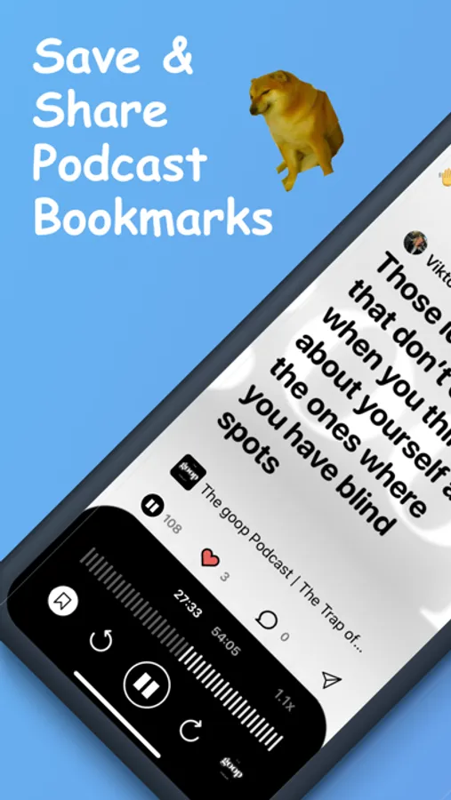 Bookmark - Podcasts are incredibly long and people talk about a lot of things in one episode, you can save only the parts that are the most interesting to you and find all your bookmarks in your profile. It's like bookmarking a book!