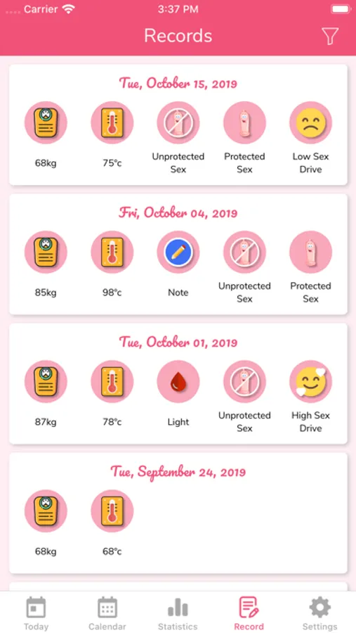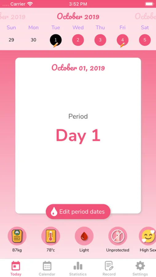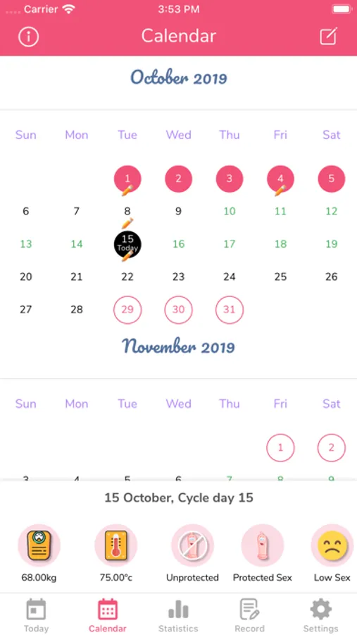 - Track your weight, temperature, mood, symptoms, intercourse, flow etc.