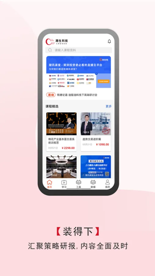 潮讯课堂隶属于杭州潮生网络科技有限公司,定位为 PGC(专业生产内容模式)的潮讯课堂致力于在线投资交易内容分享平台的建设与运营,在潮讯课堂勾画的内容生态链里,讲师、用户、品牌将通过潮讯课堂平台联结在一起。让用户更加全面及系统化地学习。我们除了拥有海量的财经投教视频之外,同时也是创作者们直播互动的交流平台。