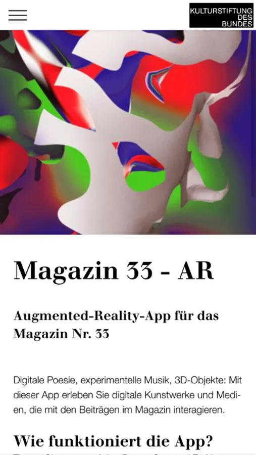 Diese AR-App erweitert das Magazin 33 „Schnittstellen“ der Kulturstiftung des Bundes inhaltlich und künstlerisch in den digitalen Raum: Erleben Sie digitale Poesie, experimentelle Musik, 3D-Objekte, eine Meme-Galerie u.v.m. Für die Nutzung der App benötigen Sie das Magazin 33. Dieses kann kostenfrei unter kulturstiftung-des-bundes.de/magazin bestellt oder online gelesen werden.