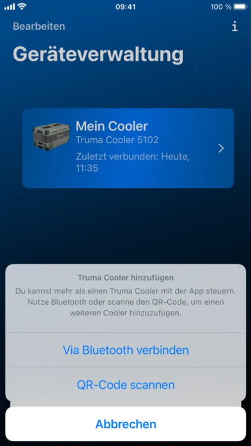 With the Truma Cooler Control app, you can control your Truma Cooler portable fridge/freezer via smartphone. Simply connect via Bluetooth or by scanning the QR Code to begin checking and adjusting its settings.