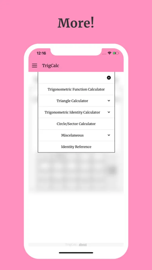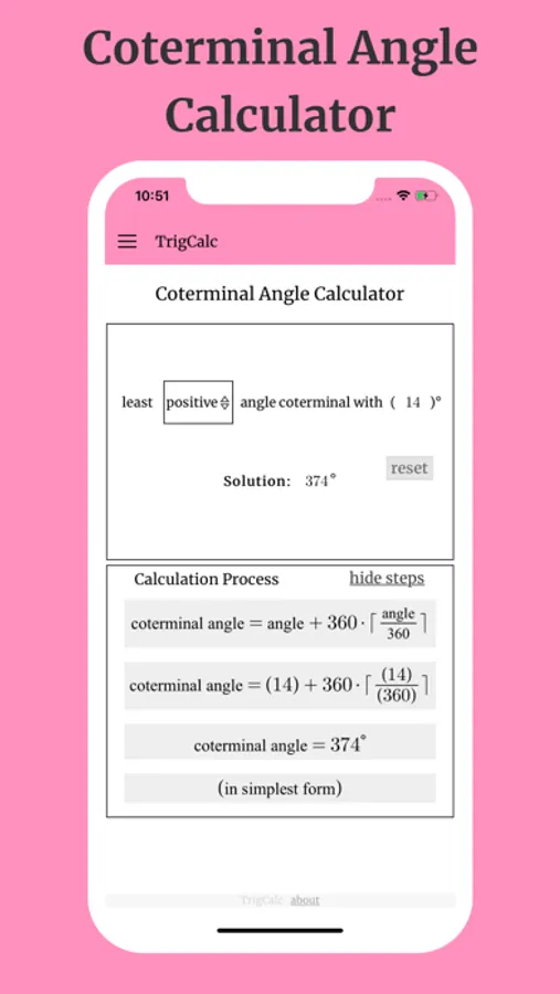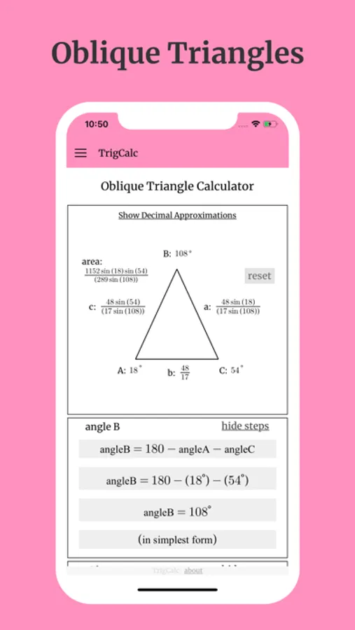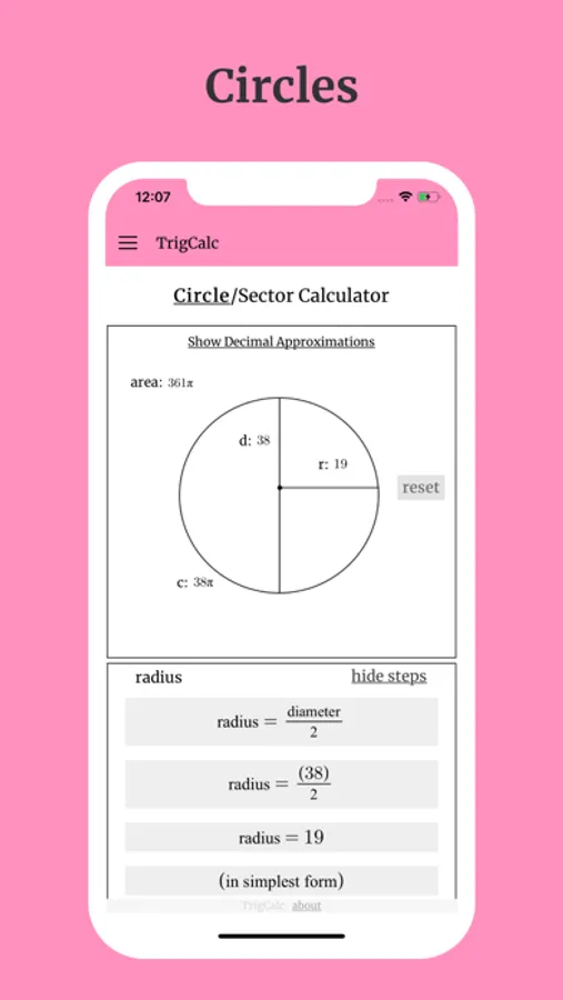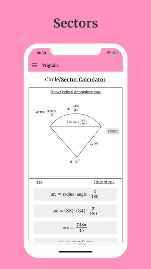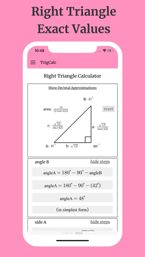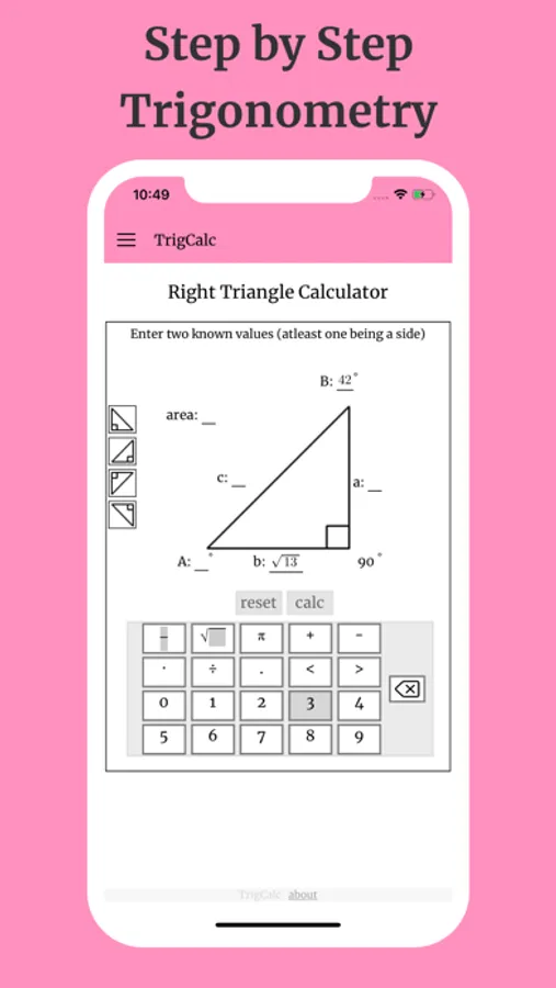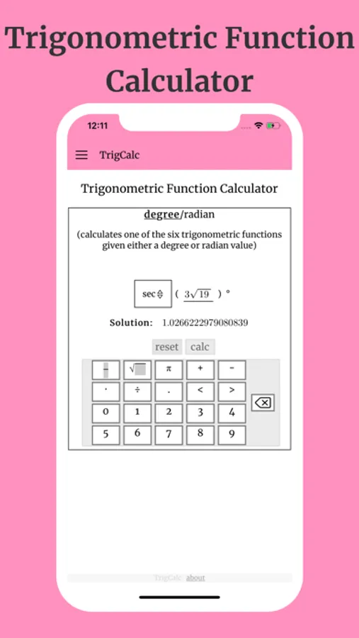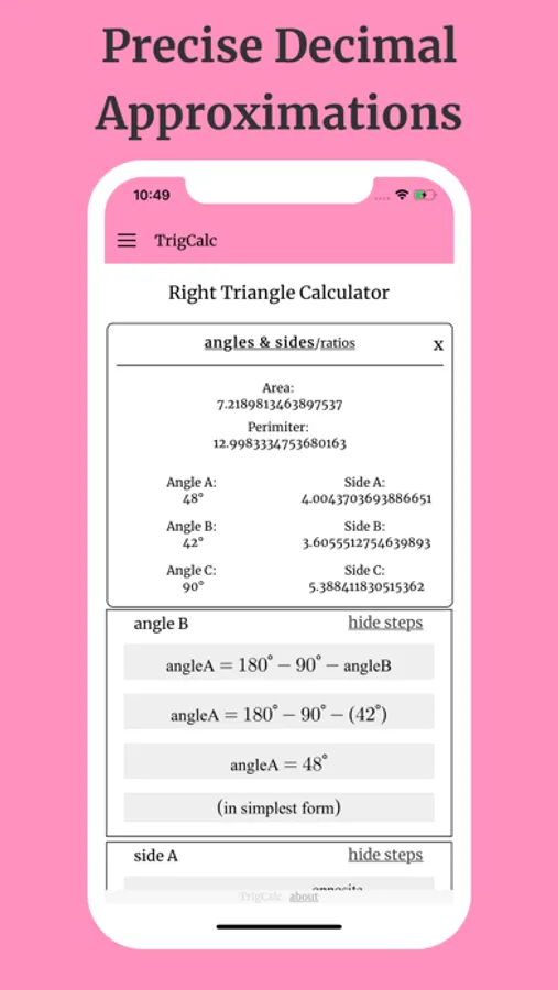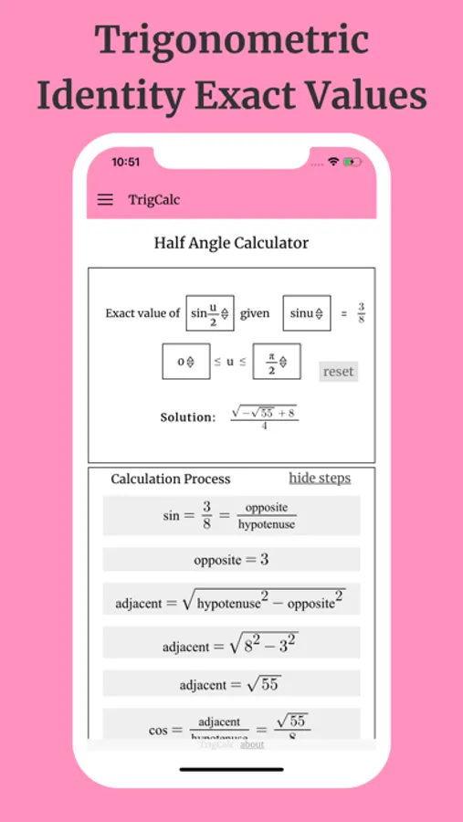 Trigcalc aims to make trigonometry calculations as simple yet detailed as possible. Trigcalc provides step-by-step solutions to some of the most common trigonometry and geometry problems. Trigcalc also uses real math notation such as radicals, exponents, fractions, pi, and more. The list of supported calculators are shown below: