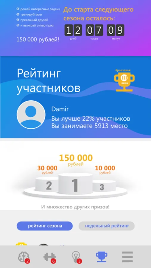 - Призовой фонд. Призы - это настоящая награда, для тех, кто уверен в своих силах. 30 лучших игроков, каждый месяц получают настоящие призы. Победить сможет тот, кто каждый день сможет отвечать на вопросы, заниматься на тренажерах для мозга, проходить тестирование и выполнять специальные задания.
