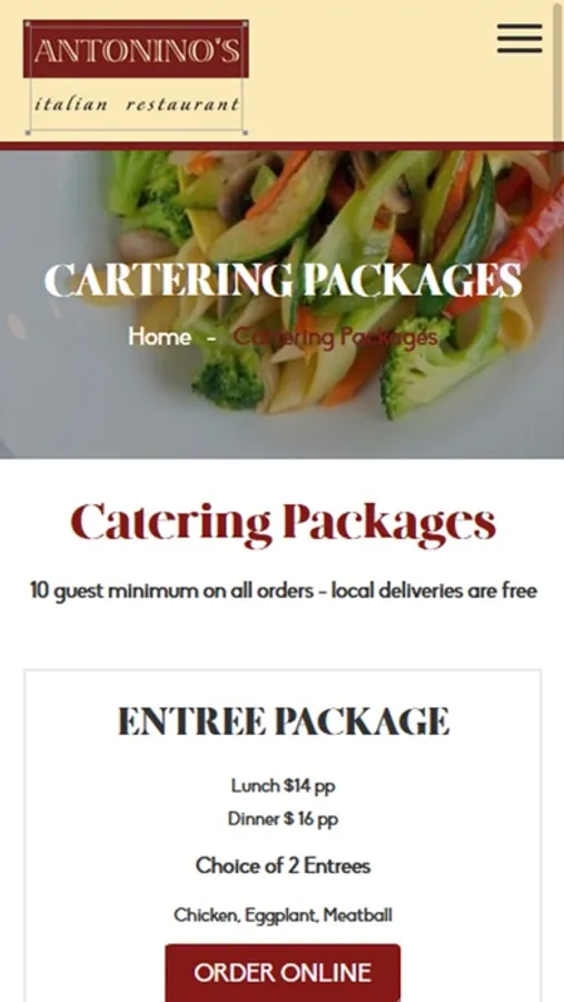 Over the years, Antonino's Italian Restaurant has enjoyed pleasing many of our customers offering the finest, most delicious homemade Italian food. We serve a very generous portion in individual & family style of: appetizers, soups, salads, an endless pasta list, our variety of chicken, veal, seafood, risotto, eggplant, & our famous pizza, heroes, calzones and rolls. We have been using the top domestic and imported ingredients to insure the perfection of our delicious dishes since our beginning in 1997. This has been proven by our signature dishes that have been consistently popular for the past decade. They include, but not limited to, Chicken Brushetta, Chicken Francese, Veal Marsala, Shrimp Fra Diavlo, Bronzini, Risotto, and our famous Eggplant Parmigiana and Eggplant Rollatini. With this great food we provide a friendly, reliable and warm wait staff, with a free delivery service.