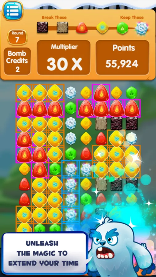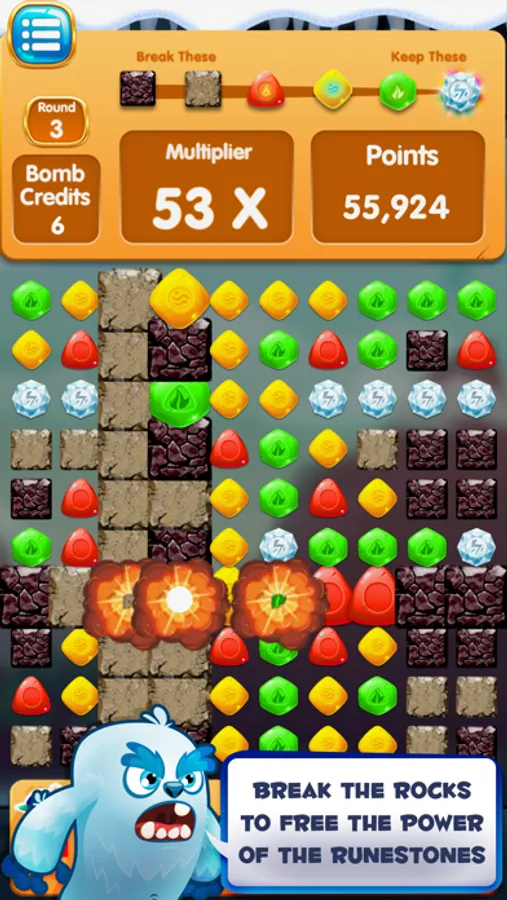 Eddie the time-bending Yeti loves shiny runestones. Boost the power of the magical runestones by destroying as many dull rocks as you can, then collect runes in groups of 3 or more to release their magic! The more magic you release, the more time the Yeti will grant to play!